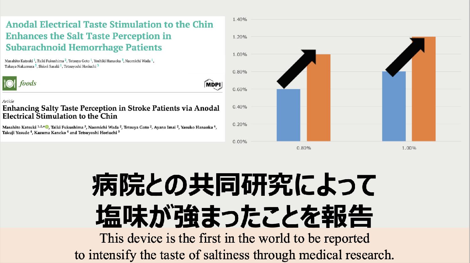 微弱な電気刺激で神経を刺激+(ナトリウムイオンの)電気泳動により塩みを強く感じられるようになります。充電式で使いやすく開発中です。